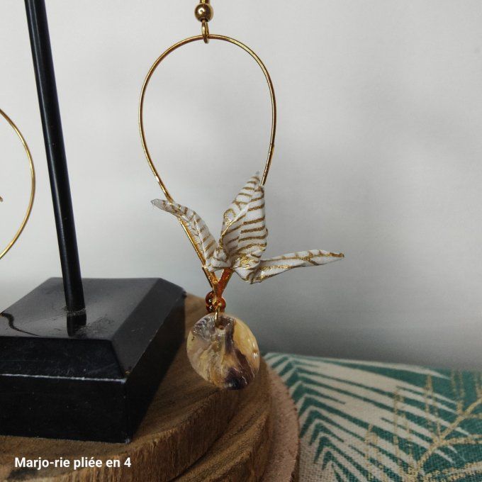 Boucle d'oreille composée de deux grues, oiseau symbolisant le bonheur au Japon. Le papier washi est dans les tons ocre, marron et or.
