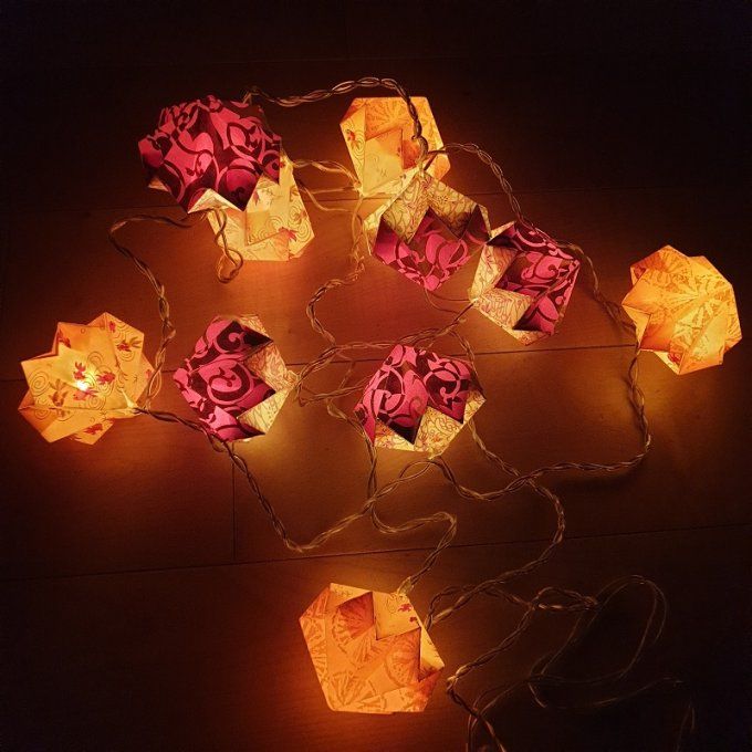 Chaque led est habillée par une pampille en papier washi plié selon l'art japonais d'origami. Les papiers utilisés sont dans les tons rose et fuschia. Cette guirlande sera idéale pour apporter une lumière douce et chaleureuse pour une chambre ou dans votre salon.